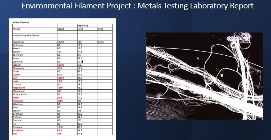 È importante notare che la diffusione di questa tecnologia è in corso da oltre 20 anni. L’analisi chimica approfondita condotta dalla Francia ha identificato molti tipi diversi di polimeri e la presenza di pericolosi ftaleni, che sono interferenti endocrini. Ho già detto in precedenza che l’avvio dell’autoassemblaggio da una scala nanometrica a una macroscala richiede l’uso di metalli come catalizzatori. Clifford Carnicom ha effettuato un’analisi che dimostra che questi filamenti ambientali contengono grandi quantità di metalli.