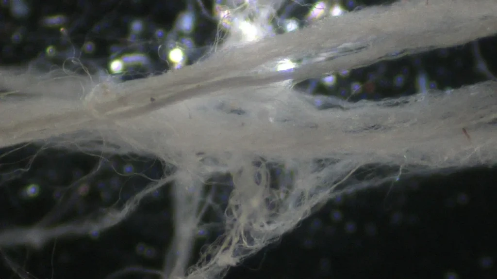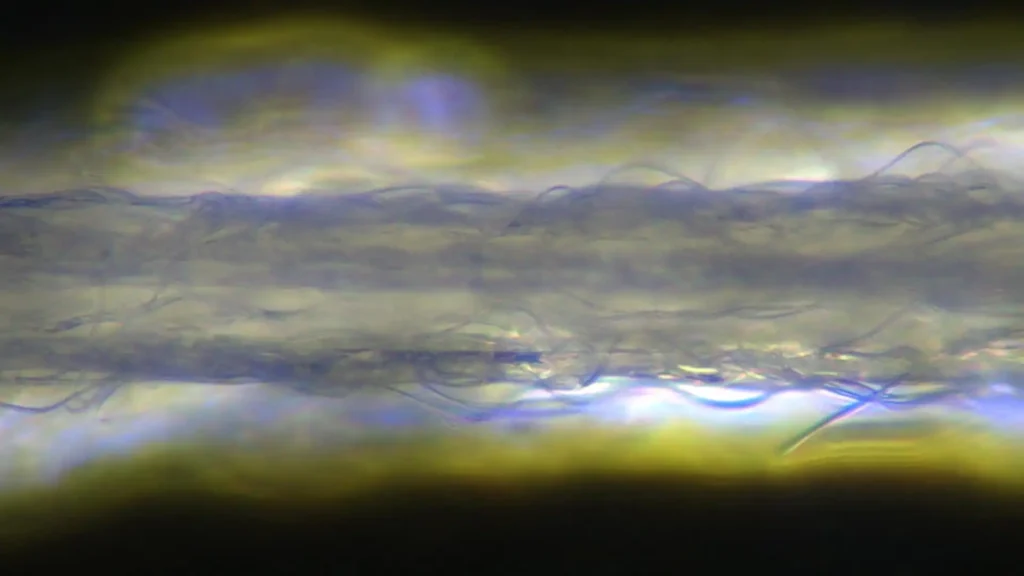 Immagine: Ingrandimento 400x, è facilmente visibile che è molto più resistente e molto più spessa della seta di ragno naturale.