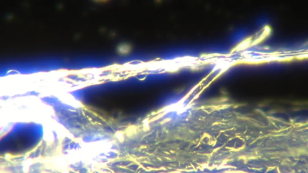 In un altro post parlerò in dettaglio dell’uso molto rivelatore delle proteine della seta di ragno, che sono poliammidi, le stesse proteine che abbiamo scoperto creare i coaguli gommosi negli esseri umani. Qui mostro prima la mia microscopia in campo oscuro del campione.