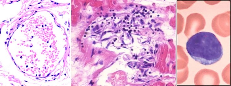 L’immagine al centro mostra una venula che viene attaccata e distrutta dal sistema immunitario. Il contorno si sta già dissolvendo e le cellule endoteliali a forma di fuso (e gonfie) si sono staccate dalla parete del vaso. Inoltre, vediamo i linfociti, le piccole cellule con nuclei scuri e rotondi e con pochissimo citoplasma intorno a loro; a destra è mostrato un singolo linfocita (a un ingrandimento molto più elevato).