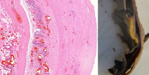 A sinistra, una sezione attraverso la parete di un’aorta. Questa foto è stata scattata con un ingrandimento ancora più basso rispetto a quello precedente; i linfociti ora appaiono solo come una nuvola di minuscoli granelli blu. A sinistra di questa nuvola blu, vediamo una crepa verticale che attraversa il tessuto. Tale crepa è visibile anche macroscopicamente nel campione asportato di un’aorta mostrato a destra.