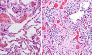 Sul lato destro, vediamo il tessuto polmonare invaso dai linfociti. Gli spazi pieni d’aria sono in gran parte scomparsi e sono stati riempiti di tessuto cicatriziale (connettivo). Questo paziente vaccinato avrebbe ovviamente avuto grossi problemi di respirazione.