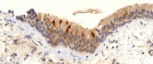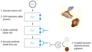 Se una particella di vaccino, composta dall’mRNA codificante lo spike, ricoperta di lipidi, entra in una cellula corporea, ciò farà sì che la proteina spike venga sintetizzata all’interno della cellula e quindi portata sulla superficie cellulare. Lì, può essere riconosciuto da un anticorpo specifico per la Spike. Dopo aver lavato il campione di tessuto per rimuovere le molecole di anticorpi non legate, quelle legate possono essere rilevate con un anticorpo secondario che è accoppiato con un enzima, spesso la perossidasi di rafano. Dopo un’altra fase di lavaggio, il campione viene incubato con un colorante precursore solubile in acqua che viene convertito dall’enzima in un pigmento marrone insolubile. Ogni molecola enzimatica può convertire rapidamente un gran numero di molecole coloranti, il che amplifica notevolmente il segnale.