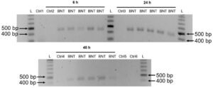 Tutti i campioni etichettati con “BNT” sono stati trattati con il vaccino e tutti mostrano un prodotto PCR della lunghezza prevista, come è evidente dal confronto con uno standard di lunghezza del frammento di DNA (“L”). I campioni etichettati con “Ctrl n” erano controlli: Ctrl 1– 4 conteneva DNA da cellule non incubate con il vaccino, Ctrl 5 conteneva RNA (non DNA) da cellule trattate con il vaccino; Ctrl 6 conteneva lo stesso ma è stato ulteriormente trattato con RNAsi, fase che è stata eseguita anche nella purificazione dei campioni di DNA. Come previsto, nessuno dei campioni di controllo contiene il prodotto PCR.