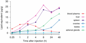 La prima cosa da notare è che il vaccino etichettato si presenta nel plasma sanguigno dopo un tempo molto breve, entro solo un quarto d’ora. Il livello plasmatico raggiunge il picco due ore dopo l’iniezione. Mentre circola, il vaccino modello si accumula in molti altri organi. L’aumento più veloce e più alto si osserva nel fegato e nella milza. Un assorbimento molto elevato si osserva anche con le ovaie e le ghiandole surrenali. Altri organi (compresi i testicoli) assorbono livelli significativamente più bassi del vaccino modello. Notiamo, tuttavia, che almeno i vasi sanguigni saranno esposti e colpiti in ogni organo e in ogni tessuto.