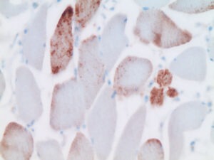 Questa diapositiva (del Dr. Burkhardt) mostra le fibre muscolari deltoidi in sezione trasversale. Diverse (ma non tutte) le fibre mostrano una forte pigmentazione marrone, indicando ancora una volta l’espressione della proteina spike.