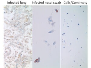 Per distinguere tra infezione e iniezione, possiamo usare ancora l’immunoistochimica, ma questa volta applicarla a un’altra proteina SARS-CoV-2, ovvero il nucleocapside, che si trova all’interno della particella virale, dove avvolge e protegge il genoma dell’RNA. La logica di questo esperimento è semplice: le cellule infettate dal virus esprimeranno tutte le proteine virali, compreso lo spike e il nucleocapside. Al contrario, i vaccini COVID basati su mRNA (così come quelli basati su vettori di adenovirus prodotti da AstraZeneca e Janssen) indurranno l’espressione solo di spike.