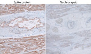Qui, vediamo l’immunoistochimica applicata al tessuto muscolare cardiaco da una persona iniettata. La colorazione per la presenza della proteina spike provoca una forte deposizione di pigmento marrone. Al contrario, con l’anticorpo che riconosce la proteina nucleocapside si osserva solo una colorazione molto debole e non specifica. L’assenza di nucleocapside indica che l’espressione della proteina spike deve essere attribuita al vaccino piuttosto che a un’infezione da SARS-CoV-2.