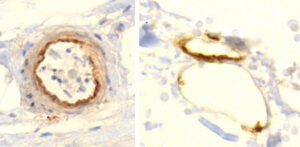 Vediamo l’espressione della proteina spike nelle arteriole (piccole arterie; a sinistra) così come nelle venule (piccole vene) e nei capillari (a destra). L’espressione è più evidente nello strato cellulare più interno, l’endotelio. Questo rende le cellule endoteliali “anatre sedute” per un attacco da parte del sistema immunitario.