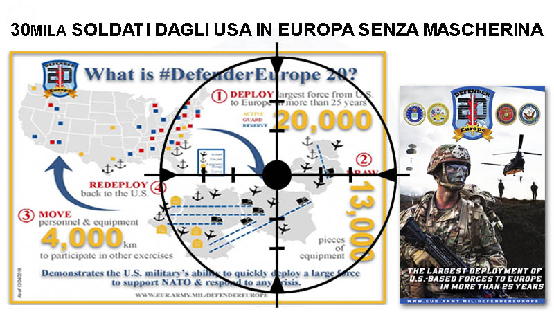C’è però una categoria di cittadini Usa esentata da tali norme: i 20.000 soldati che cominciano ad arrivare dagli Stati uniti in porti e aeroporti europei per l’esercitazione Defender Europe 20 (Difensore dell’Europa 2020), il più grande spiegamento di truppe Usa in Europa degli ultimi 25 anni. Compresi quelli già presenti, vi parteciperanno in aprile e maggio circa 30.000 soldati Usa, affiancati da 7.000 di 17 paesi membri e partner della Nato, tra cui l’Italia.