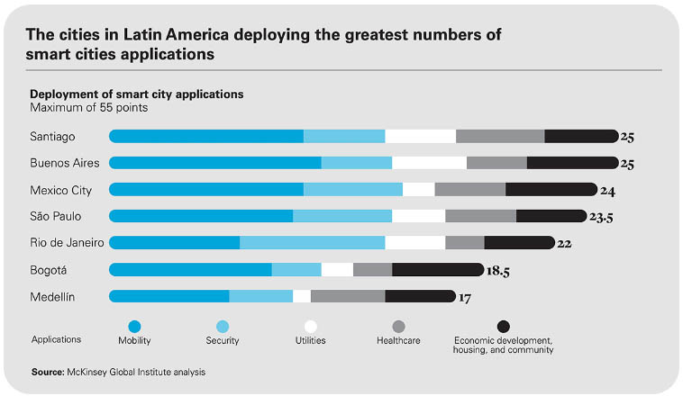 E in effetti, viene lanciato a tutta velocità. A Rio De Janeiro, ad esempio, 450.000 lampioni vengono sostituiti con luci a LED dotate di 5G. Il grafico sottostante mostra come le principali città dell’America Latina si stanno trasformando in Smart Cities.