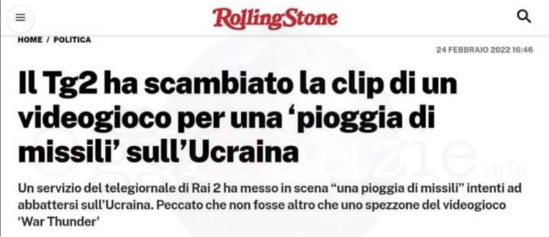 Un caso clamoroso è stato quello del Tg2 che in ben due edizioni, quella delle 8:30 e quella delle 17:30 del giorno 24 febbraio, ha utilizzato le immagini di un videogioco di guerra spacciandole come riprese esclusive dell’attacco in corso in Ucraina. Un caso che ricorda quello del Tg di La7 del gennaio 2021, quando il direttore Enrico Mentana mostrò delle immagini del film Project X presentandole come riprese dell’assalto a Capitol Hill.