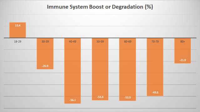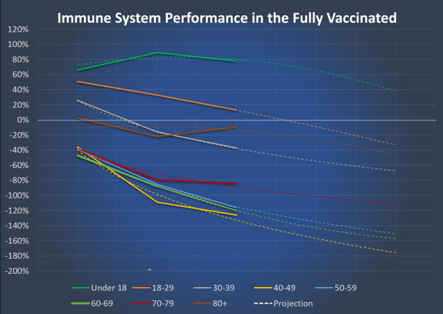 Quando si combinano queste cifre con la degradazione settimanale della risposta immunitaria del 5% catalogata dall’UKHSA dalle settimane 35-41 , si inizia a vedere un’immagine che suggerisce che i vaccinati stanno sviluppando la sindrome da immunodeficienza acquisita.