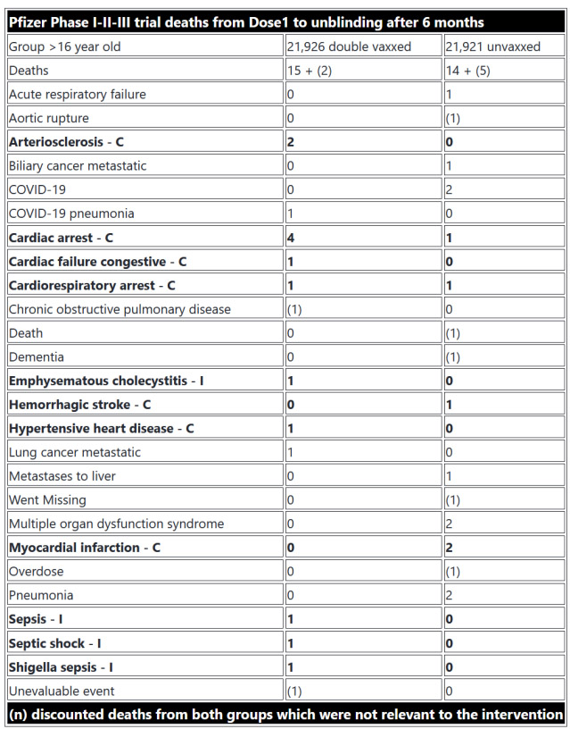 Ecco la tabella dei decessi per lo studio Pfizer dalla dose 1 (luglio 2020) allo smascheramento dopo 6 mesi (gennaio 2021) –