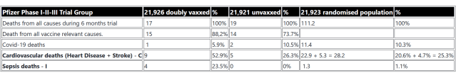 Ho scoperto alcuni risultati estremamente preoccupanti nei dati degli studi clinici di fase I-II-III della Pfizer. Il tasso di mortalità per sepsi nel gruppo di 21.926 vaccinati con doppia vaccinazione dello studio clinico di fase III Pfizer era ventuno volte superiore al normale e il tasso di mortalità cardiovascolare era due volte superiore al normale.