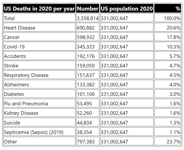 Ecco i decessi negli Stati Uniti nel 2020 per causa e le percentuali per ciascuna causa.