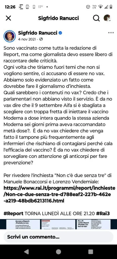 Ranucci e i suoi in quel periodo sollevavano qualche lievissima critica alla dittatura che si era manifestata in quegli anni, ma nelle loro dichiarazioni in realtà sostenevano l’intero impianto della operazione terrosistica del coronavirus, a partire della precisazione che lui e la sua redazione si erano sottoposti alla vaccinazione sperimentale Covid, seguita dalla raccomandazione a utilizzare di più il tampone PCR, vero e proprio meccanismo truffa a base della falsa pandemia per via della sua nota inaffidabilità che sforna il 90% di falsi positivi.