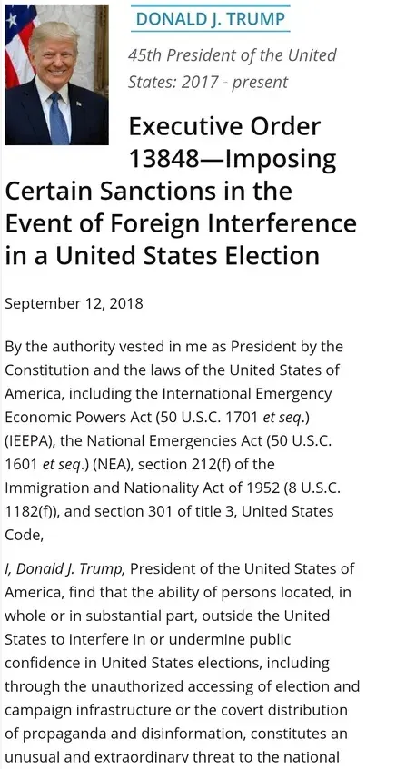 Questa è la storia di un piano ben studiato da Donald Trump e dai suoi, che già nel 2018 aveva già firmato degli ordini esecutivi, si ricordi il celebre ordine 13848, nel quale era scritto chiaramente come gli Stati Uniti dovessero adottare delle misure emergenziali per contrastare tentativi stranieri di ingerenze nelle sue elezioni.