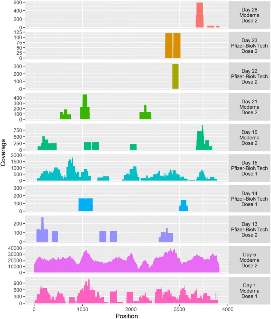 …”Dei 108 campioni di pazienti, 10 campioni (9,3%) presentavano sequenze parziali o complete della sequenza di m-RN_A del V.(Fig. 1), identificate da uno a 28 giorni dopo la V. L’identità tra le sequenze nucleotidiche di m-RN_A rilevate nel plasma e l’m-RN_A specifico del V. somministrato era del 100%. I 10 campioni avevano una mediana di 5,5 milioni di coppie di letture grezze disponibili (vedi Tabella S1). L’ampiezza e la profondità della copertura delle sequenze di m-RN_A del V. variavano dalla completezza e >20 000, rispettivamente, a brevi frammenti con una profondità di copertura di 100 (Fig. 1). Nessuno dei controlli negativi o HCV-positivi presentava letture corrispondenti a SARS-CoV-2“.