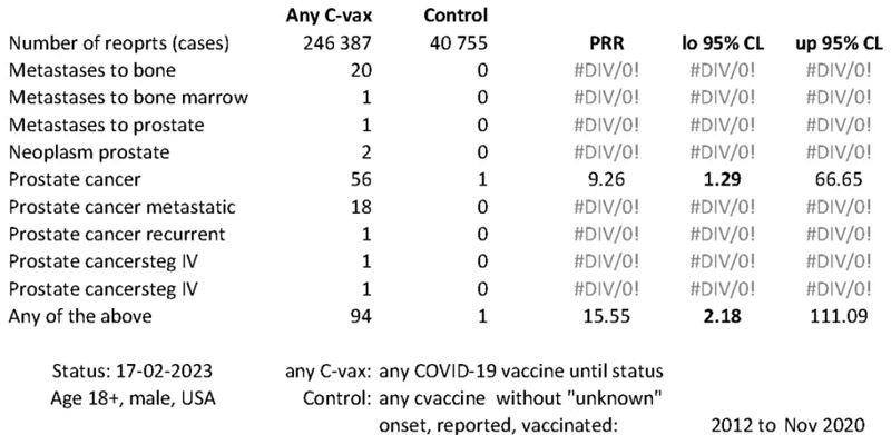 Attenzione! I database di farmacovigilanza o le loro analisi non sono adatti a stimare le incidenze, ma solo a identificare i rischi in modo qualitativo o semiquantitativo. Nel caso del cancro alla prostata, si può affermare che il cancro alla prostata è chiaramente più frequente dopo i vac C19 rispetto alle vacc.naz.oni precedenti, almeno circa 2,2 volte più frequente, ma forse fino a 15 o addirittura 100 volte più frequente.