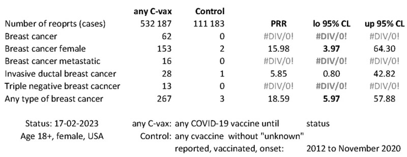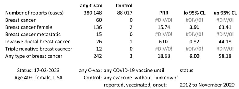 Il cancro al seno nelle donne ha una frequenza simile a quella del cancro alla prostata negli uomini. Le analisi di sproporzionalità mostrano che il cancro al seno nelle donne è chiaramente un rischio dei vac C19. Il rischio è aumentato di almeno 6 volte dal vac C19.