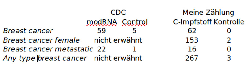 Le regole di valutazione sono riportate nelle tabelle. Esse sono spiegate sopra. Tuttavia, i termini per il cancro al seno sono molti di più e più finemente differenziati rispetto a quelli per il cancro alla prostata. Per questo motivo, nelle tabelle che seguono, mostro solo i più importanti. Inoltre, per i seguenti 13 termini (48 menzioni in totale), sono state trovate da 1 a 6 segnalazioni dopo la vacc.naz.one C19, ma nessuna per il controllo: