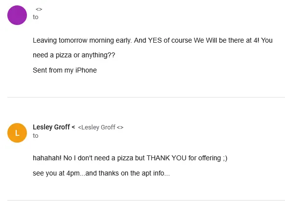 Se si prova a scrivere la parola “pizza”, ad esempio, nell’archivio delle email, verranno fuori delle strane conversazioni nelle quali Epstein chiede alla sua assistente Lesley Groff, se in vista del suo arrivo domani avesse bisogno di un po’ di pizza, una richiesta alla quale la donna risponde no, sopraggiunto subito da un caloroso “GRAZIE”, scritto a caratteri maiuscoli, a voler sottolineare la profonda gratitudine nei riguardi del pedofilo per una richiesta a dir poco bizzarra.