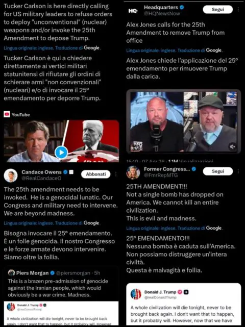 Quel giorno c’è stata una lenzuolata di tweet scritti da personaggi come Tucker Calrson, Candace Owens, Alex Jones e Marjorie Green, ognuno dei quali si impegnava a chiedere con forza l’utilizzo del 25° emendamento, l’arma per dichiarare Trump come “infermo di mente” e sostituirlo in quello che non sarebbe stato altro che un colpo di Stato.