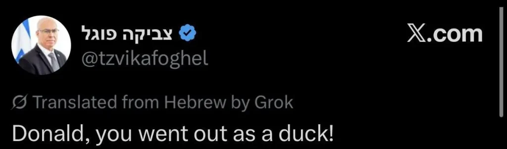 Tziva Foghel, capo della commissione della sicurezza nazionale della Knesset accusa Trump di essere uscito fuori dalla crisi in Medio Oriente come una “papera