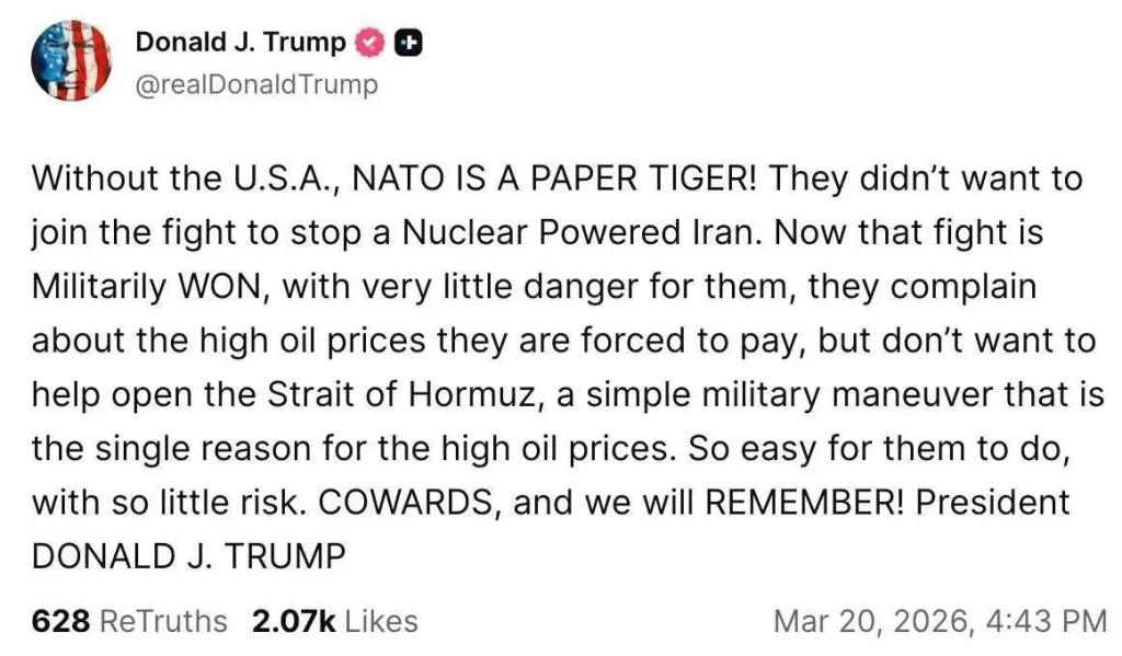Trump ha iniziato a manifestare dichiarazioni sempre più ostili nei riguardi della NATO tanto da dire “non ce ne dimenticheremo”, in riferimento al rifiuto del Patto Atlantico di scendere al suo fianco in una inesistente volontà di rovesciare Teheran.