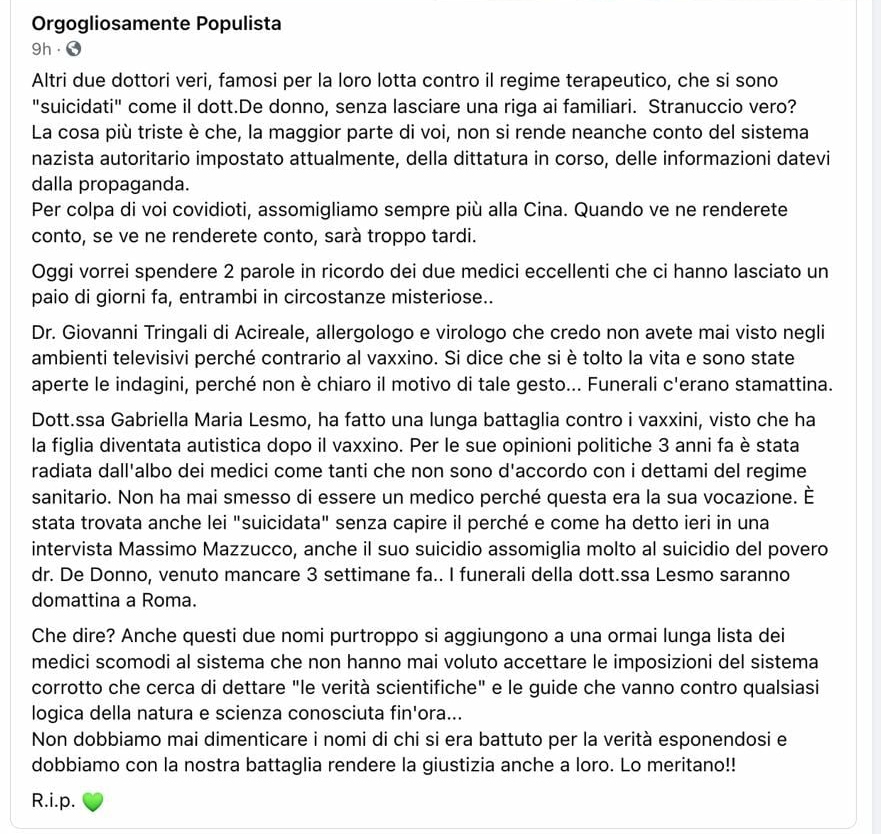 Share Facebook Twitter LinkedIn WhatsApp Email Un post da fb che fa rabbrividire, ma intanto il Drago della TV e tutti i suoi seguaci continuano imperterriti a seminare panico e terrore per portare tutti alla sperimentazione di massa organizzata dell’elite Li hanno suicidati come De Donno Medici troppo scomodi
