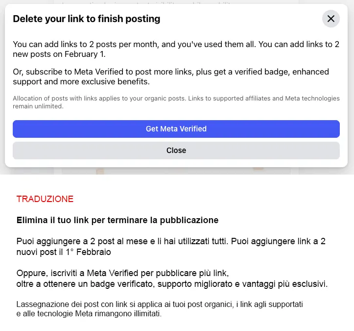 Non link spam. Non truffe. Non abusi. Link semplici e ordinari. L’elemento costitutivo più elementare di Internet. Pubblica troppi post e non potrai più completarne uno a meno che tu non elimini il link o paghi. Paga per Meta Verified e improvvisamente la restrizione scompare. Questa è la transazione. Nessuna discussione. Nessuna spiegazione. Solo un messaggio di sistema che ti informa con calma cosa ti è ora consentito fare.