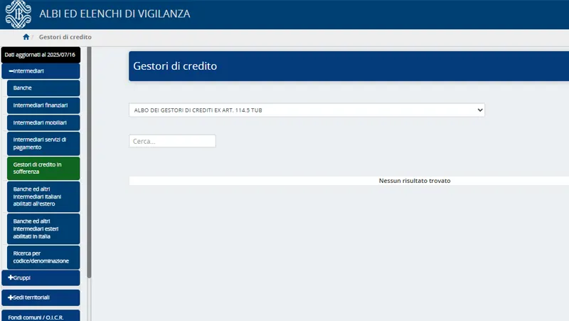 Per cercare un’azienda di recupero crediti se è iscritta all’albo clicca qui e scorri fino a trovare “Albi ed elenchi di vigilanza” clicca sopra il collegamento e nella pagina che segue clicca su “Gestori di credito in sofferenza” nel menu di sinistra