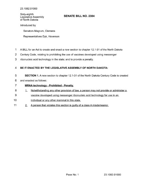 Il disegno di legge aggiunge legislatura al capitolo 12 del North Dakota Century Code che “proibisce l’uso di vaccini sviluppati utilizzando la tecnologia a base di acido ribonucleico messaggero [mRNA] nello stato; e commina una sanzione”. La sanzione proposta, nella forma in cui il disegno di legge è attualmente formulato, è punibile come reato di classe A e si estende non solo agli esseri umani, ma anche ai mammiferi per proteggere il nostro approvvigionamento alimentare e l’agricoltura.