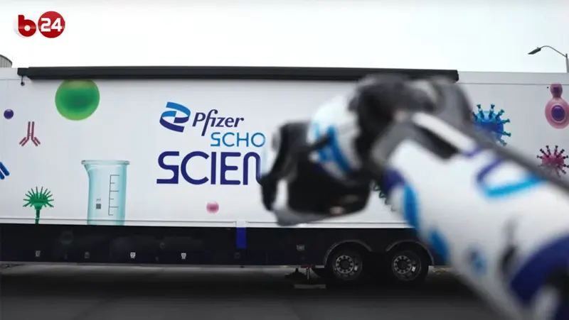 Nella clip si possono vedere gruppi di bambini entrare gioiosi nel bus targato Pfizer, vestire il camice bianco e assistere alle lezioni impartite dai dipendenti della multinazionale. Il tutto sotto la supervisione di un inquietante cane robot, molto simile a quelli utilizzato da alcuni corpi di polizia per stanare i delinquenti.