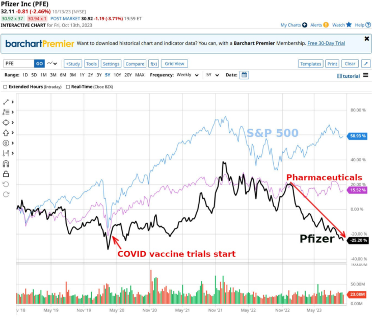 Dai un’occhiata al grafico qui sotto: le azioni Pfizer (PFE) valgono il 25% in meno rispetto a cinque anni fa, nonostante la società abbia guadagnato miliardi di dollari dalle vendite di vaccini Covid e il mercato azionario più ampio e l’indice farmaceutico siano aumentati: