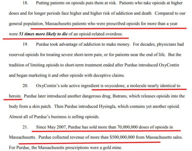 La storia della Purdue Pharma – la sua incessante spinta verso dosi più elevate di oppioidi somministrate ai pazienti per renderli dipendenti – è molto più lunga della storia dei vaccini Covid. Questo post non è il posto migliore per una storia completa. La migliore introduzione rapida alla cattiva condotta della famiglia Sackler, proprietaria della Purdue Pharma, è leggere la causa del Massachusetts. (Vedi PDF )