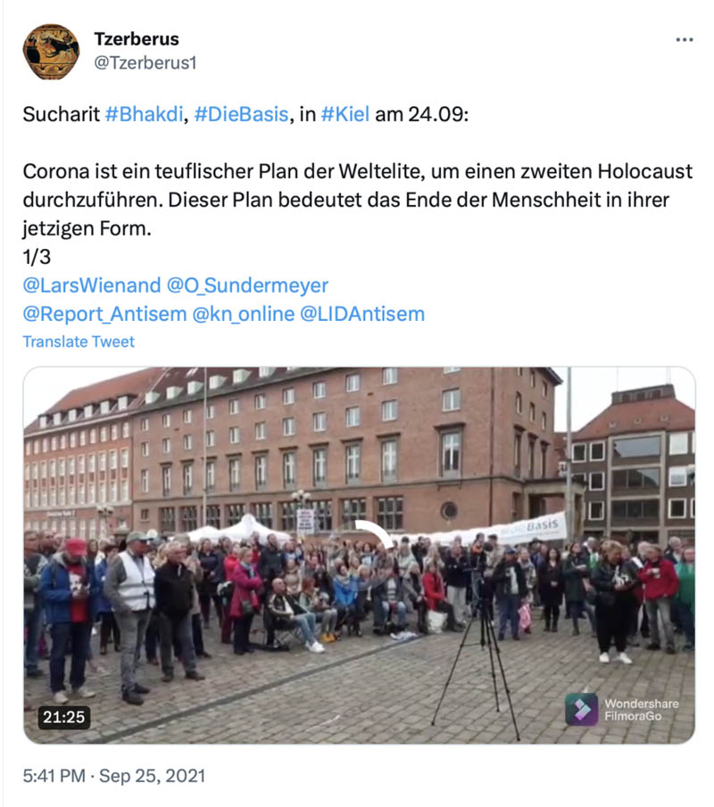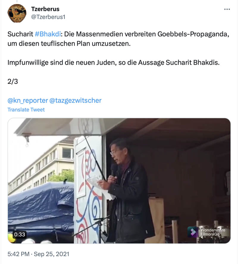 Il 25 maggio 2023, Tzerberus1, ha pubblicato su Twitter due video del Prof. Bhakdi che parla a un evento dopo la sua audizione il 23 maggio 2023. Uno dei video pubblicati cattura l’audio di un uomo sconosciuto tra il pubblico che afferma “è come un Olocausto.” Tuttavia, Tzerberus1 ha etichettato l’Associazione federale dei dipartimenti per la ricerca e l’informazione sull’antisemitismo (RAIS) e ha accusato il prof. Bhakdi, anche se non ha mai menzionato tali parole.