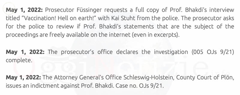 Il caso storico risale al 1° maggio 2022, quando il pubblico ministero di Kiel e il commissario per la lotta all’antisemitismo dello stato dello Schleswig-Holstein, Silke Füssinger, hanno emesso un atto d’accusa contro il Prof. Bhakdi, accusandolo di due capi d’accusa.