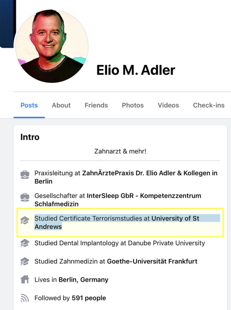 È importante notare che il dottor Adler, che è stato il secondo individuo a presentare una denuncia contro il Prof. Bhakdi il 14 luglio 2021, non è solo un dentista e un personaggio pubblico in quanto presidente di Die Wertinitiative eV, ma ha anche un certificato in Studi sul terrorismo dall’Università di Sant’Andrea. Secondo il sito web dell’università, lo studio “in Terrorism and Political Violence esamina approcci selezionati alla generazione di conoscenza sul terrorismo e sull’antiterrorismo”.