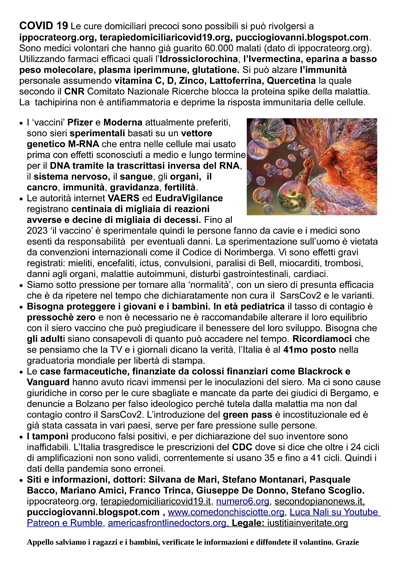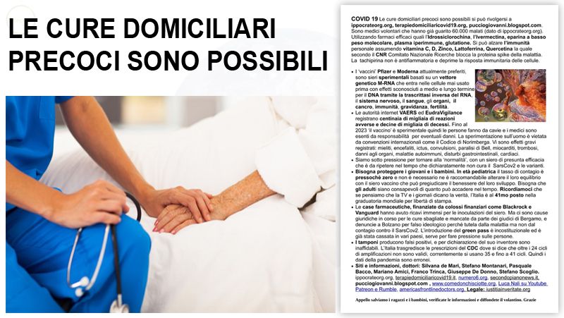 COVID 19 Le cure domiciliari precoci sono possibili si può rivolgersi a ippocrateorg.org, terapiedomiciliaricovid19.org, pucciogiovanni.blogspot.com. Sono medici volontari che hanno già guarito 60.000 malati (dato di ippocrateorg.org). Utilizzando farmaci efficaci quali l’Idrossiclorochina, l’Ivermectina, eparina a basso peso molecolare, plasma iperimmune, glutatione. Si può alzare l’immunità personale assumendo vitamina C, D, Zinco, Lattoferrina, Quercetina la quale secondo il CNR Comitato Nazionale Ricerche blocca la proteina spike della malattia.