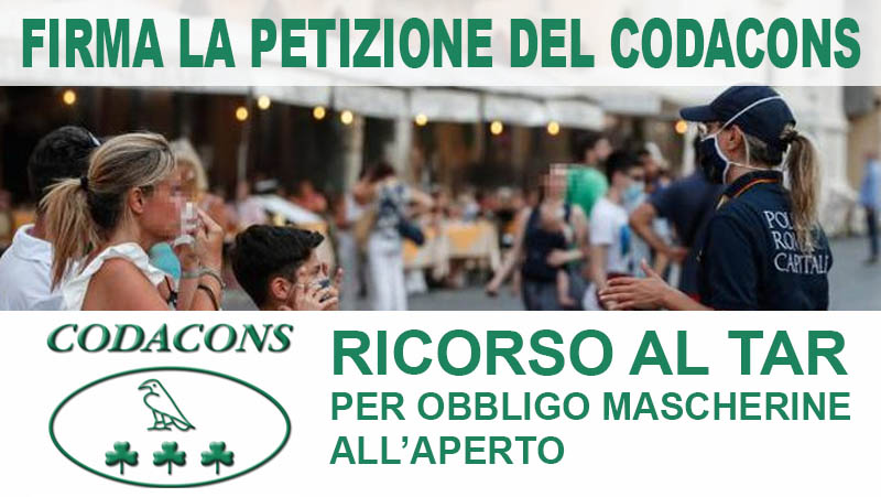E’ stato vinto il ricorso al TAR per l’obbligo vaccinale nel Lazio, ora è arrivato il momento di riunirsi tutti e FIRMARE la petizione creata dal CODACONS per l’obbligo delle mascherine all’aperto nel Lazio, questo creerà un precedente per tutte le altre regioni d’Italia.