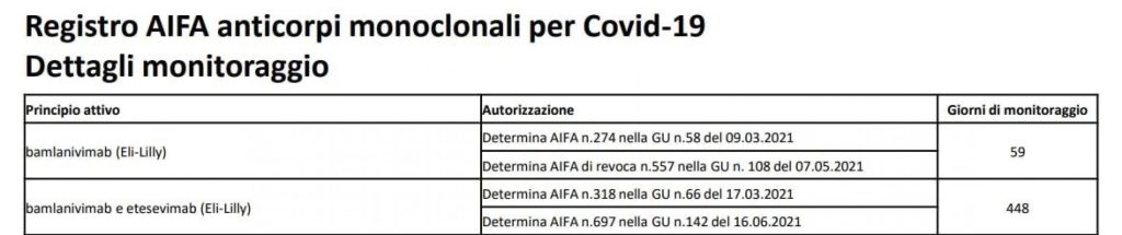 Difatti a seguito di numerose e scrupolose ricerche sul sito governativo, non abbiamo trovato nessun numero di AIC, però abbiamo trovato qualcosa di interessante: la determina n. DG/577/2021- REVOCA la Determina n. DG/274/2021 del 9 marzo 2021, concernente l’impiego del farmaco Bamlanivimab (vedi tabella).