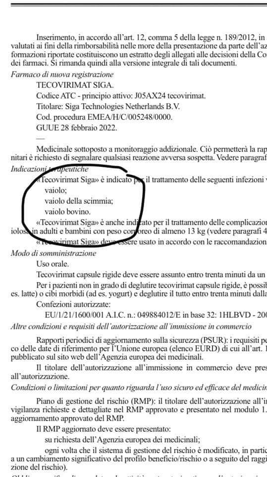 Nella Gazzetta Ufficiale del 12/04/2022 a pag.22, veniva approvato il farmaco per il vaiolo delle scimmie.