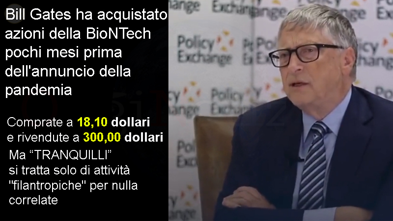Bill Gates ha acquistato azioni di BioNTech (partner di Pfizer per le sue iniezioni mRNA Covid) nel settembre 2019… pochi mesi prima che la pandemia fosse annunciata… Gates ha acquistato 1.038.674 azioni al prezzo di offerta pre-pubblica di 18,10 dollari per azione… Gates ha venduto le sue azioni nel novembre 2021 ad un prezzo di vendita medio di $ 300 per azione… Gates lo stesso giorno ha detto… “Abbiamo bisogno di un nuovo modo di fare i vaccini, perché i vaccini *non hanno fermato la trasmissione*”… nonostante tutte le sue precedenti affermazioni contrarie. È quasi come se Gates sapesse che il Covid-19 sarebbe stato rilasciato e sapesse anche che i vaccini non sono mai stati progettati per fermare la trasmissione.
