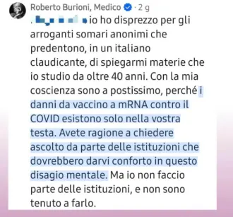 Uno dei commentatori ha chiesto l’opinione del dott. Roberto Burioni, taggandolo direttamente e il professore è intervenuto direttamente. Ma la conversazione ha lasciato di ghiaccio i danneggiati: «Il problema è distinguere gli effetti che avvengono dopo il vaccino da quelli che avvengono a causa del vaccino», ha esordito Burioni. Una risposta più che diplomatica dato che il problema principale è proprio quello di collegare la causalità alla temporalità. E per questo il Comitato ha risposto in modo pacato, con un filo di speranza che finalmente anche lui, anche il volto noto della tv potesse prendersi a cuore il dramma di migliaia di persone.