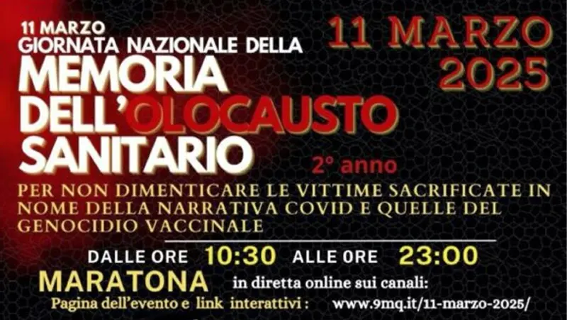 Per finire, un appuntamento per tutti voi. Quello con l’iniziativa che, l’11 marzo, mette in rete tanti che hanno subito i danni dai letali vaccini a mRNA e titolata “Giornata nazionale della MEMORIA DELL’OLOCAUSO SANITARIO”.
