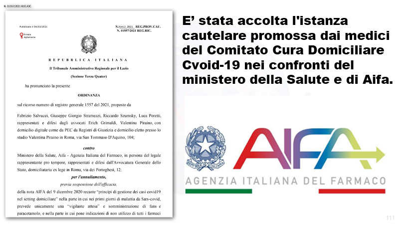 Ora è stata invece accolta l’istanza cautelare promossa dai medici del Comitato Cura Domiciliare Covid-19 nei confronti del ministero della Salute e di Aifa.