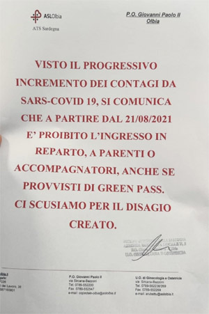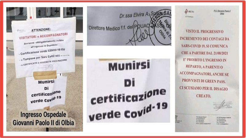 Si noterà che la comunicazione che i pazienti del Giovanni Paolo II di Olbia hanno trovato il messaggio in foto firmato dalla Dott.ssa Elvira Anna Solinas (Direttore Facente Funzioni – (rapp. esclusivo) del presidio ospedaliero di Olbia). Aggiungiamo che dal 21/08, come da documentazione fotografica, vi è il Divieto “all’ingresso in reparto a parenti o accompagnatori, anche se provvisti del Green Pass”.