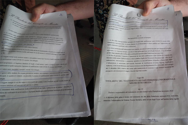Io dissi loro che negli ospedali il Green Pass non era obbligatorio e loro hanno ribattuto rispondendo che la certificazione verde è obbligatoria dal 6 agosto, mostrandomi copia dell’Art. 13 “Verifica delle certificazioni verdi COVID-19 emesse dalla Piattaforma nazionale-DGC” del Decreto